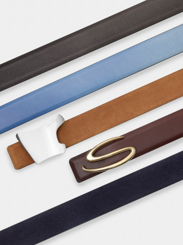 Ceintures en cuir faites à la main à partir de matières nobles auxquelles assortir les boucles siglées Santoni, en jouant sur les couleurs et les matières, pour donner vie à un style personnalisé.