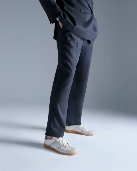 Ispirata a un design d'archivio, la DBS Oly sneaker ha un look retrò che ricorda le classiche scarpe da tennis anni '70. Questo modello da uomo ha una silhouette elegante e leggera ed è realizzato in pelle con rinforzi in suede sulla punta e sull'allacciatura. Il dettaglio laterale in pelle sfumata con profili a zig-zag si ispira all'elemento signature della maison: la doppia fibbia, mutuata dalle calzature formali e trasformata in un segno moderno. La suola sottile in gomma dalla tonalità naturale enfatizza il fascino retrò del design.